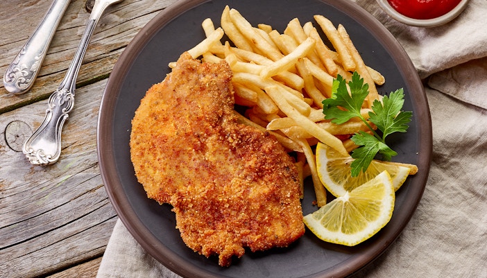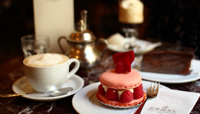 Menu : Café viennois et pâtisseries, et plats autrichiens et européens tels que schnitzel, pâtes, steak et salades, y compris des options végétariennes et végétaliennes.